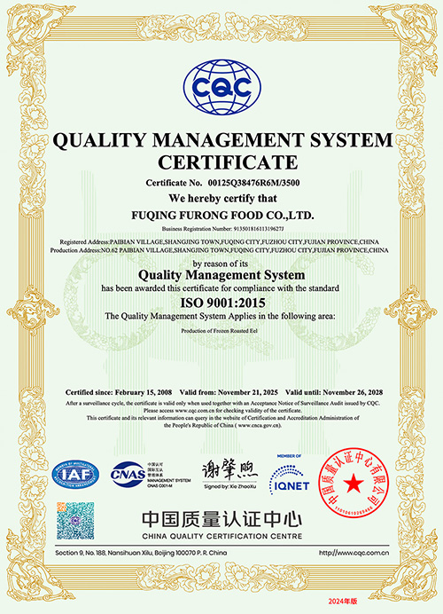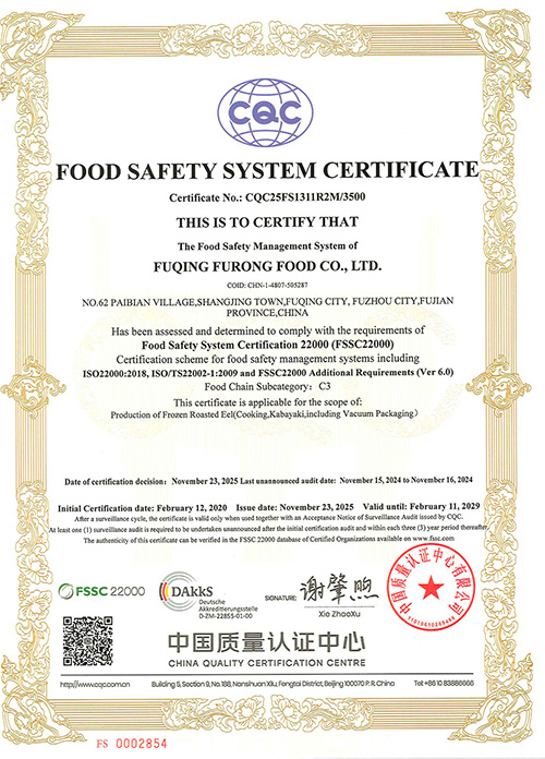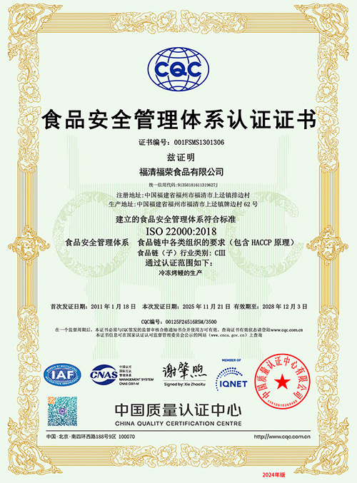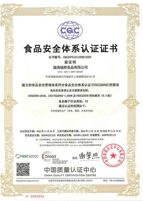 一九九七年十二月公司一次性通过ISO9002:1994标准认证,一九九八年十二月取得官方HACCP验证证书 ; 数年以来,质量体系和食品的安全管理体系不断得到完善和发展,公司在通过ISO9001:2000标准认证的基础上,于2008年取得ISO9001:2008认证,2010年十二月在通过HACCP官方验证的基础上取得了ISO22000:2005及第三方HACCP认证证书,产品经检验检疫局检验检疫和日本厚生省检验均达到100%合格。公司的质量管理水平得到了福清市政府的充分肯定,获得了福清市政府颁发的“质量管理先进奖”。