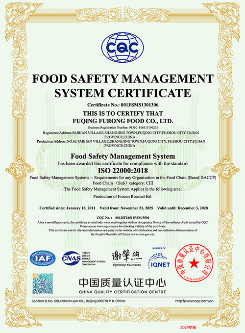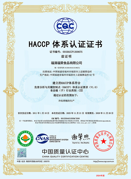 一九九七年十二月公司一次性通过ISO9002:1994标准认证,一九九八年十二月取得官方HACCP验证证书 ; 数年以来,质量体系和食品的安全管理体系不断得到完善和发展,公司在通过ISO9001:2000标准认证的基础上,于2008年取得ISO9001:2008认证,2010年十二月在通过HACCP官方验证的基础上取得了ISO22000:2005及第三方HACCP认证证书,产品经检验检疫局检验检疫和日本厚生省检验均达到100%合格。公司的质量管理水平得到了福清市政府的充分肯定,获得了福清市政府颁发的“质量管理先进奖”。